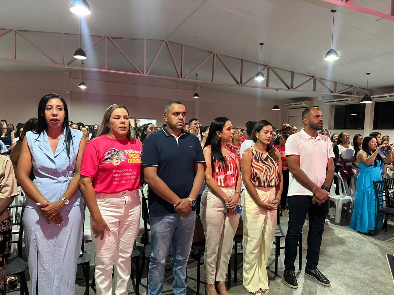 Estiveram presentes o prefeito Thiago do Vale, a secretária municipal de Educação Iandra Gusmão, vereadores, secretários municipais e profissionais da educação, que lotaram o auditório do Centro Cultural Elofilo Marques, reafirmando o compromisso com a educação pública de qualidade.