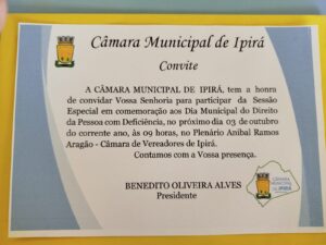 Em comemoração ao Dia Municipal dos Direitos da Pessoa com Deficiência, A Câmara de Vereadores de Ipirá, estará realizando nesta sexta-feira(03/10) a partir das 09h, uma Sessão Especial para comemorar a data. A sessão acontecerá no Plenário Anibal Ramos Aragão.
