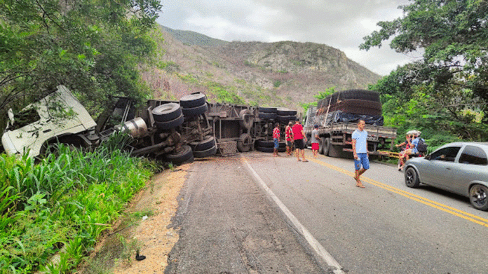 Por volta das 8h da manhã deste sábado (30), caminheiros conseguiram liberar meia pista da BR 324, na altura da curva do balneário em Jacobina, após uma carreta tombar e ficar atravessada na via, por volta das 4h da madrugada.