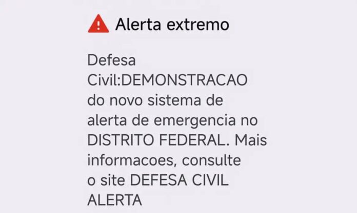 “Defesa Civil: Demonstração do novo sistema de alerta de emergência no Distrito Federal. Mais informações, consulte o site Defesa Civil Alerta”, diz a mensagem.