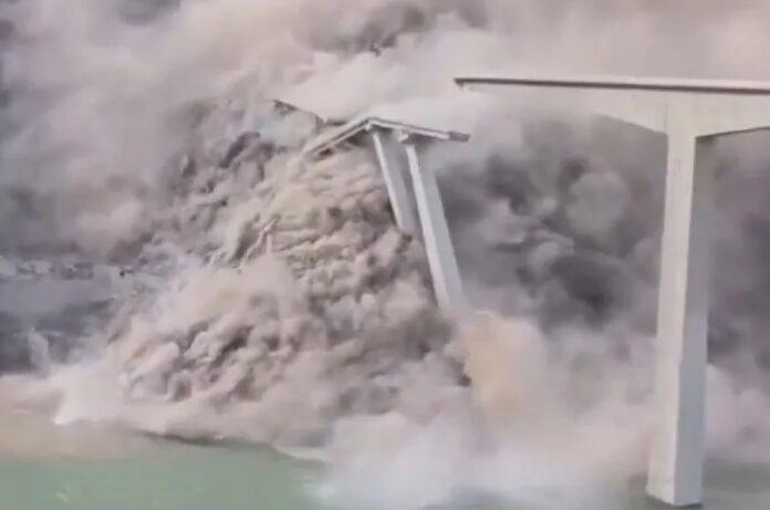 Vídeos publicados nas redes sociais (e que pode ver na galeria), mostram o momento em que as terras começam a deslizar, derrubando parte da ponte e a estrada. O colapso levantou uma enorme nuvem de poeira, enquanto a estrutura caía.