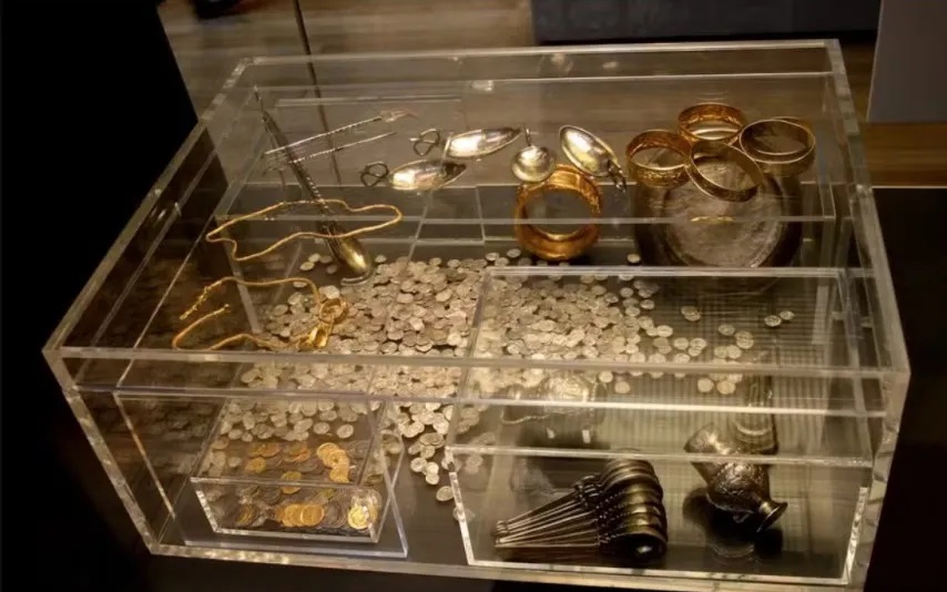 Durante a escavação, também foram encontrados vestígios de madeira e outros materiais orgânicos. Essas evidências indicaram que os objetos estavam guardados em um baú de carvalho, com divisórias internas protegidas por palha e tecido.