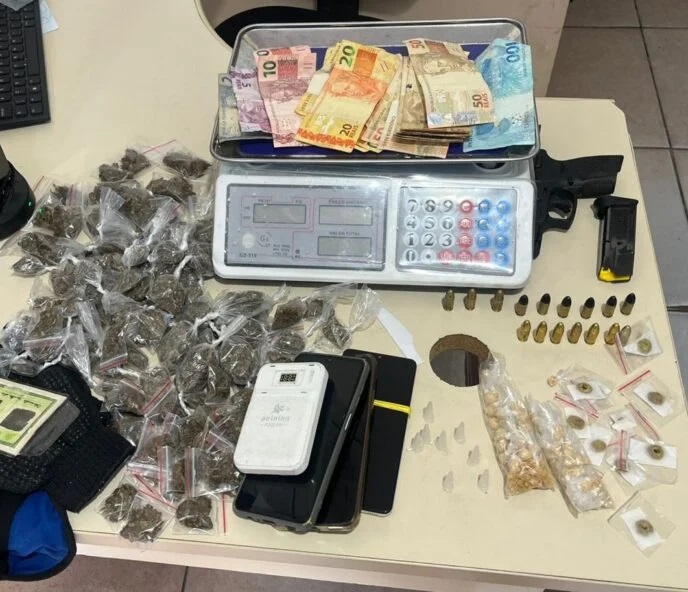 Após as buscas, foram encontradas uma pistola calibre 9mm, munições calibre 9mm e 38, 108 porções de maconha, 10 embalagens contendo haxixe, oito pinos de cocaína, dois sacos com crack, uma balança de precisão e R$ 687,00.