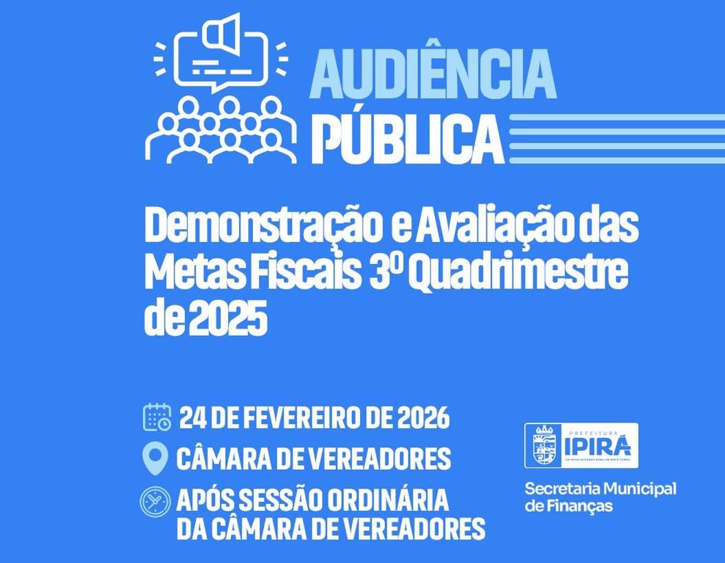 A Prefeitura de Ipirá, por meio da Secretaria Municipal de Finanças, realizará uma Audiência Pública para a demonstração e avaliação do cumprimento das metas fiscais referentes ao 3º quadrimestre de 2025. A atividade atende ao que determina a legislação vigente e reforça o compromisso com a transparência na gestão dos recursos públicos.