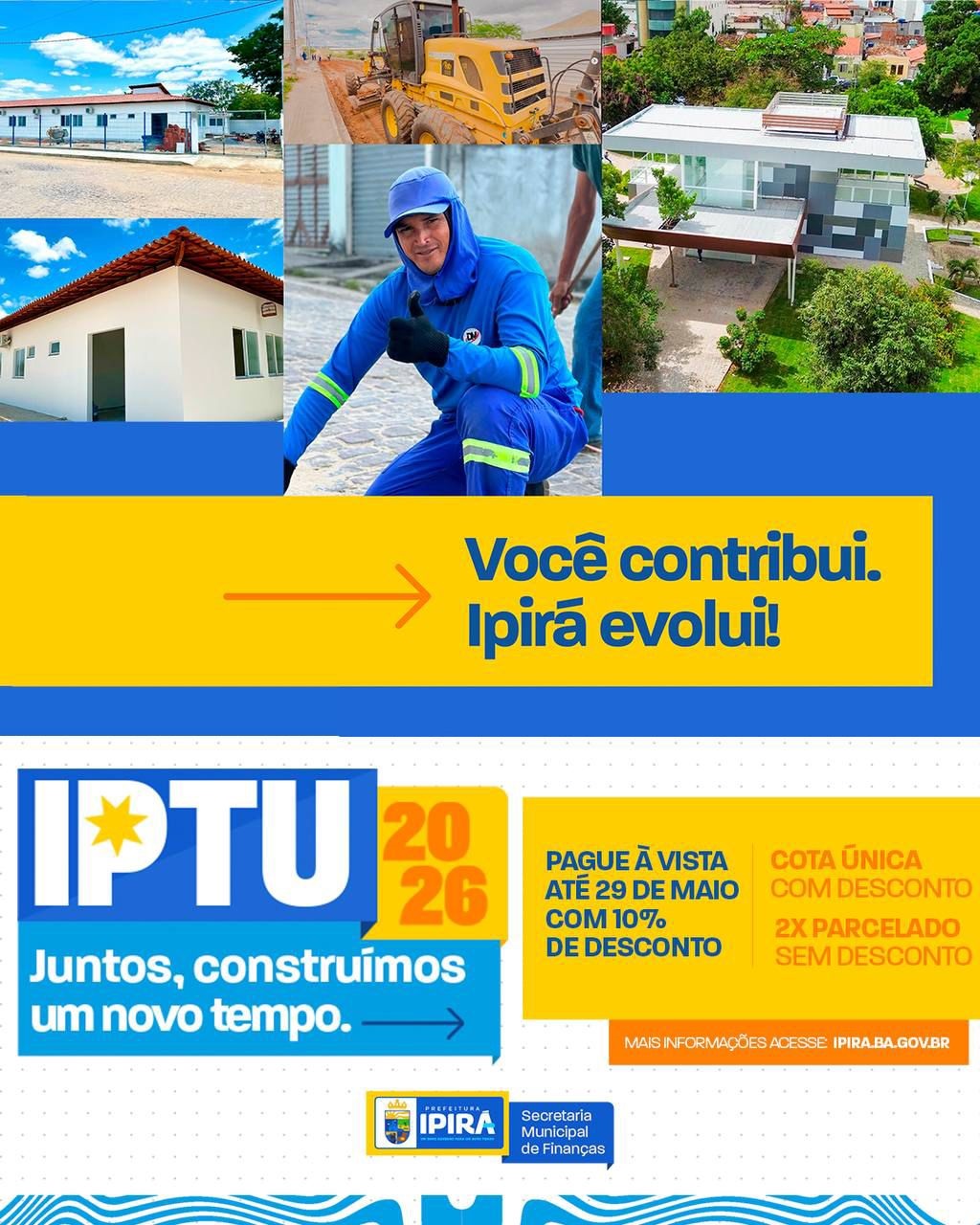A Prefeitura de Ipirá reforça aos contribuintes que o pagamento do IPTU 2026 pode ser feito com desconto para quem optar pela cota única.